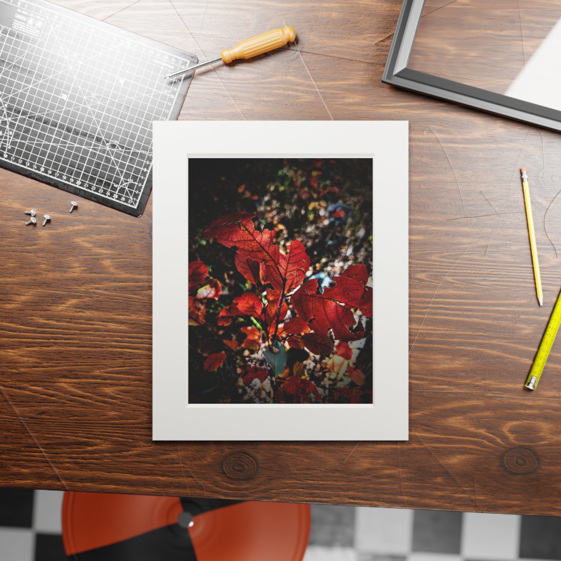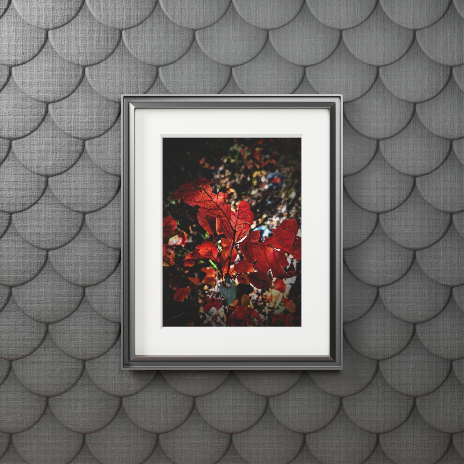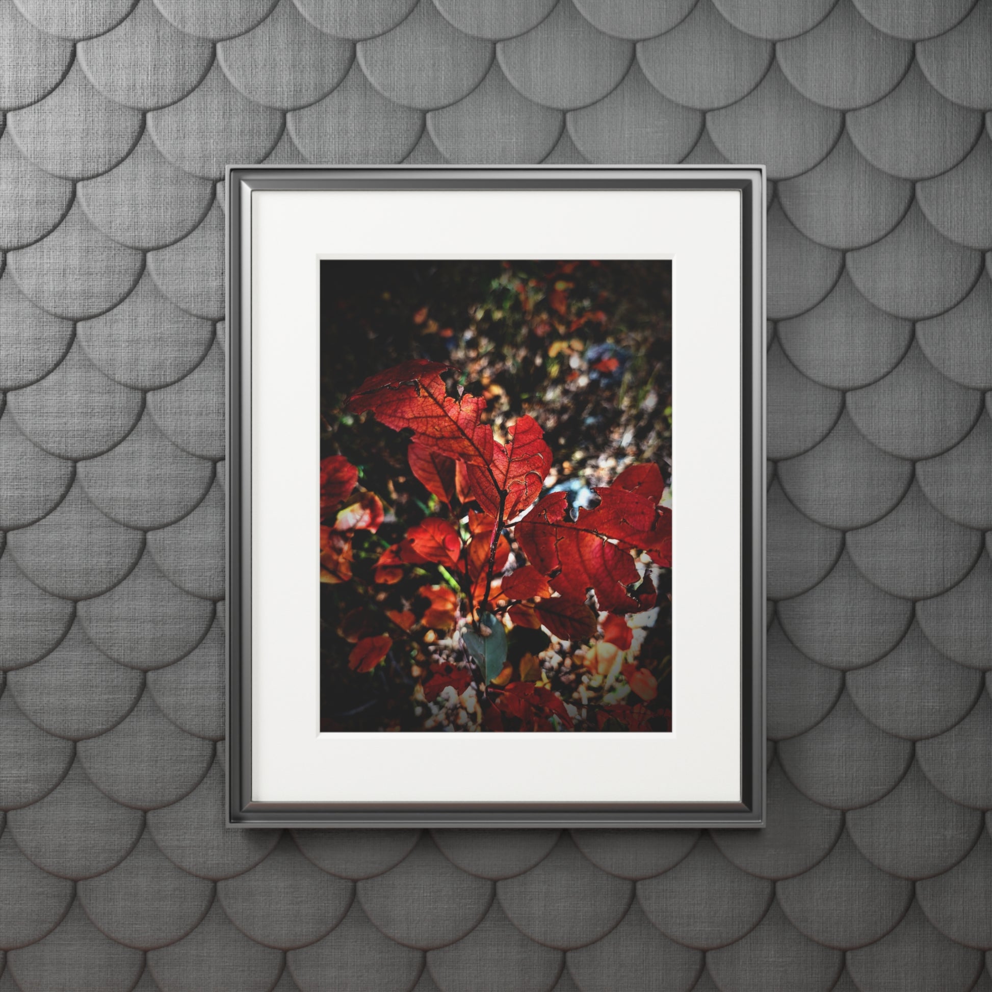 A burst of resilient color against the darkening world. The deep, almost blood-red leaves, though bearing the marks of time, stand tall and illuminated. This print celebrates the intense beauty and fragility of life, reminding us that even small things can shine with extraordinary intensity. It's a vivid, uplifting piece that brings a powerful focal point of color and hop to any room.
