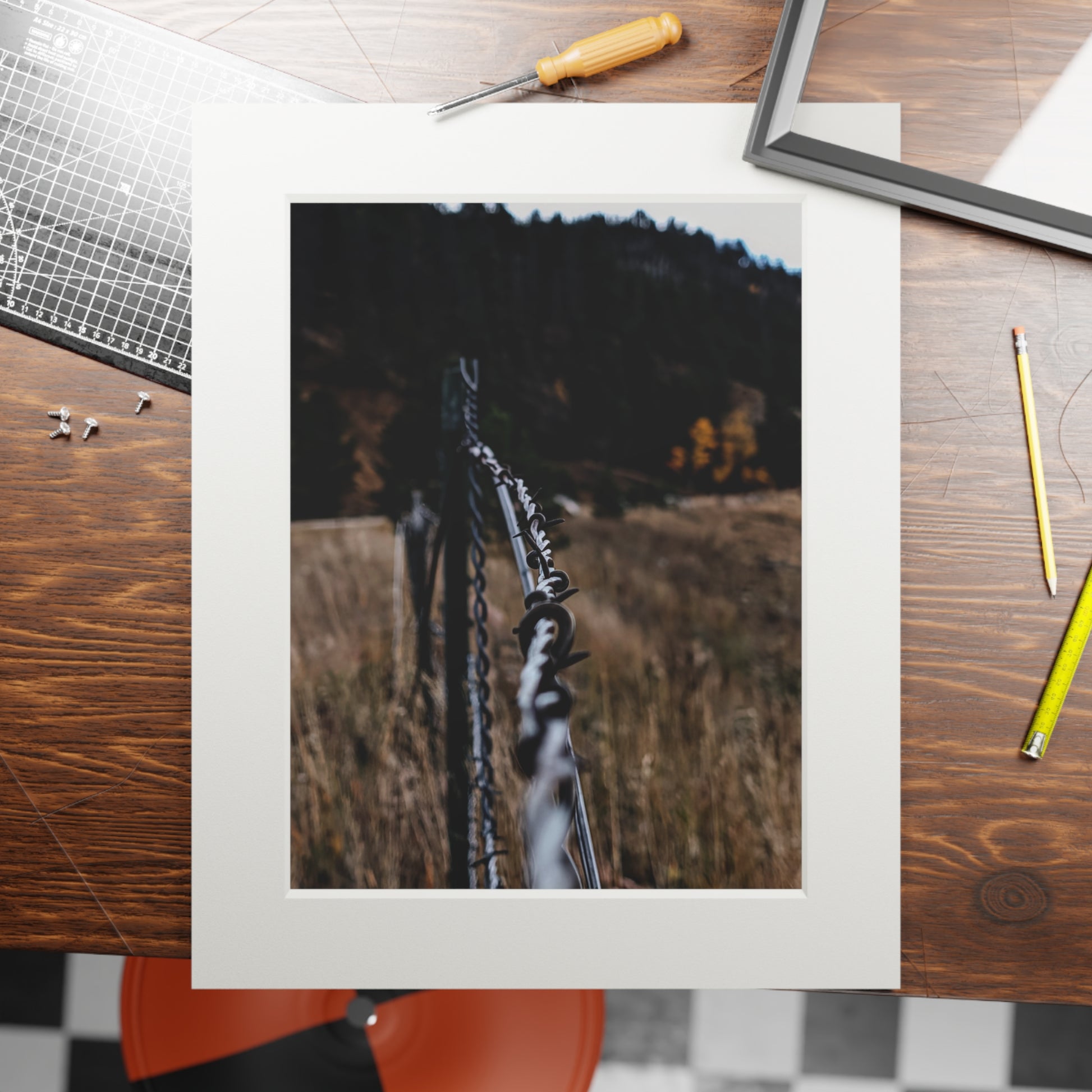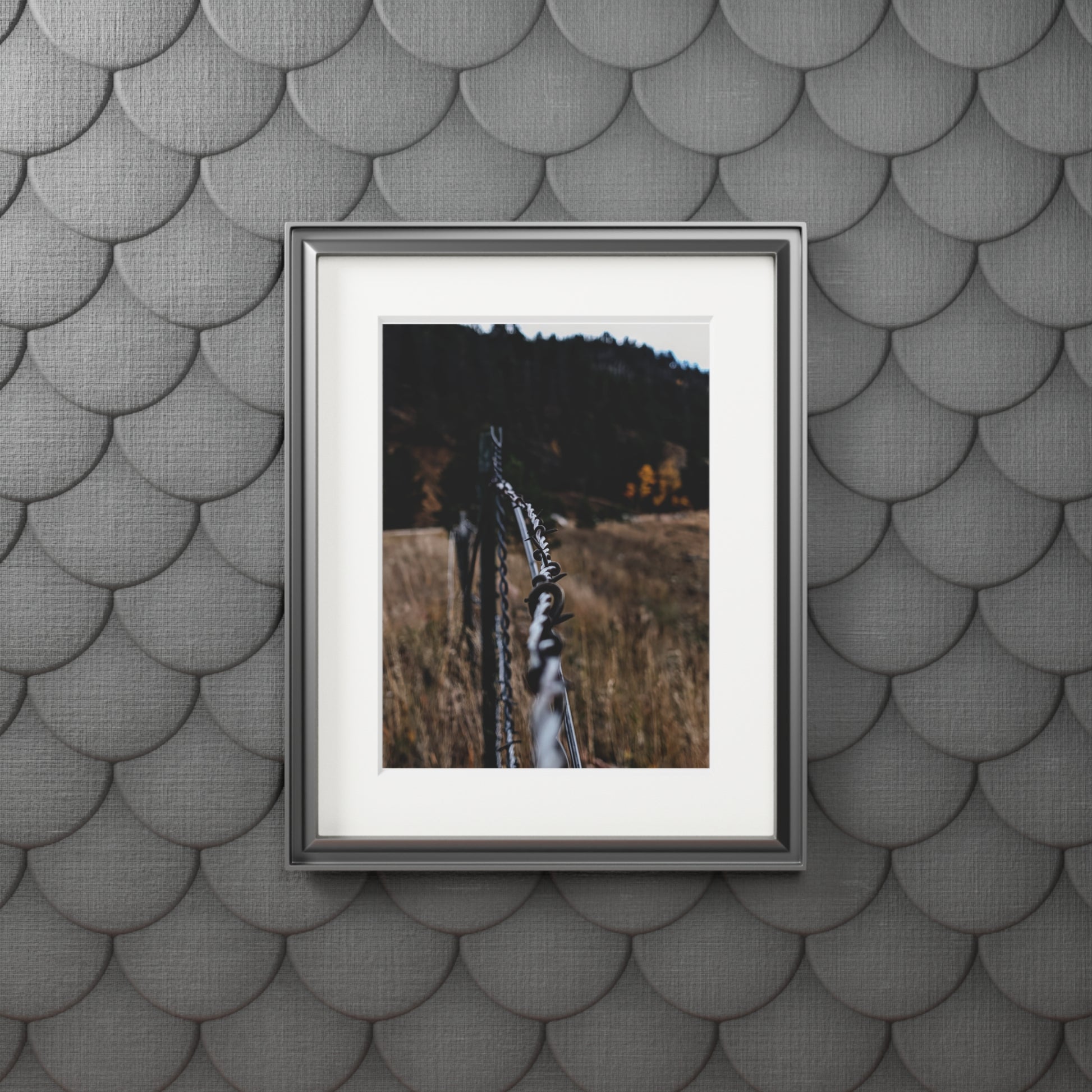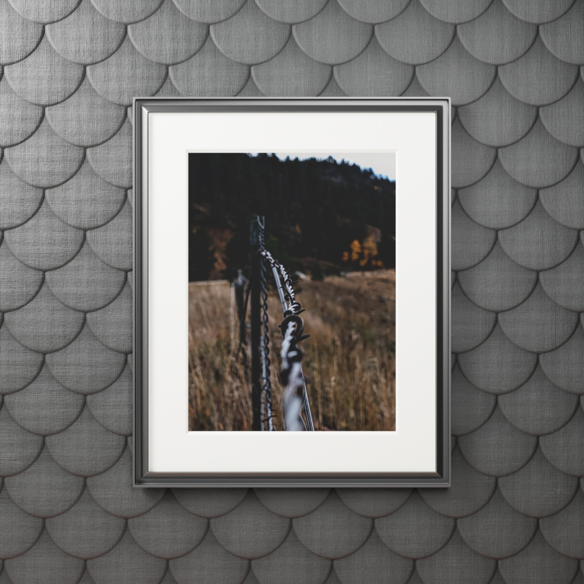 A powerful meditaion on boundaries. Tha harsh, coiled tension of the barbed wire is set against the soft, organic backdrop of the autumn landscape. This print explores the necessary divisions in our lives, whether physical or emotional. It's a piece that is both ruggedly beautiful and thought-provoking--a reminder that the most compelling stoires often exist where the rigid human structure meets the endless flow of nature.